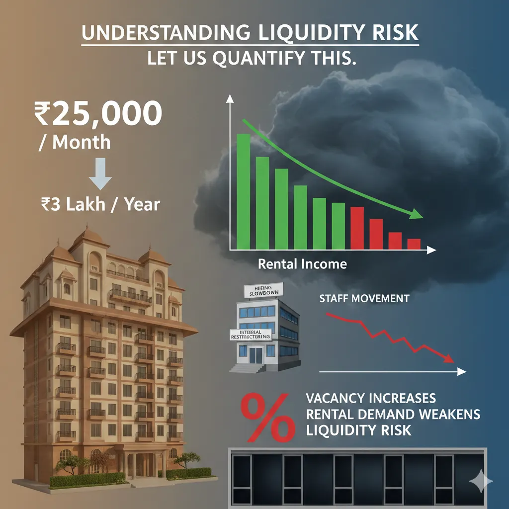 Now consider a scenario where hiring slows down or internal restructuring reduces staff movement. Rental demand weakens. Vacancy increases.
